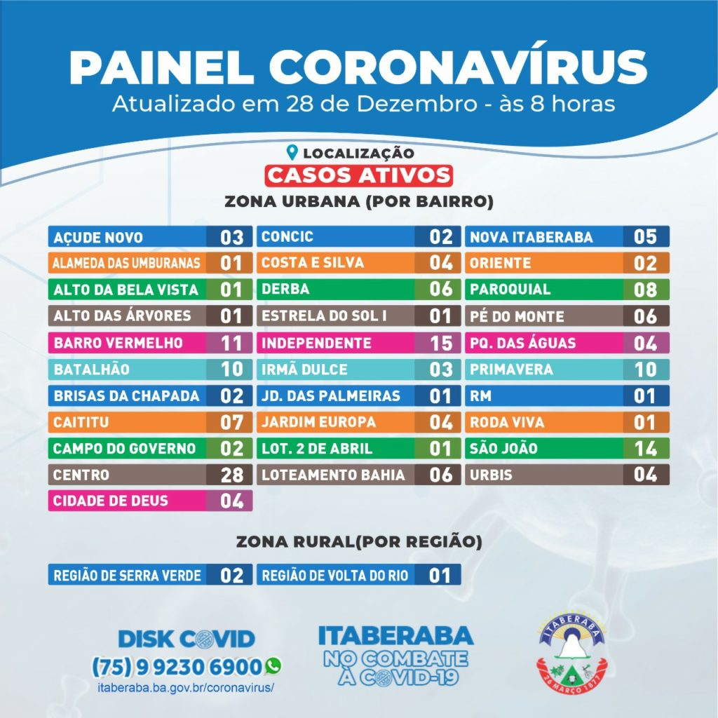 A Prefeitura de Itaberaba, por meio da Secretaria Municipal de Saúde (Sesau), assim como da Coordenação de Vigilância em Saúde e da Câmara Técnica (CT) de enfrentamento da pandemia do novo coronavírus, informa o Boletim Oficial 28/12 ㅡ com dados consolidados até às 17h de domingo (27) ㅡ que NÃO registrou novos casos da COVID-19.