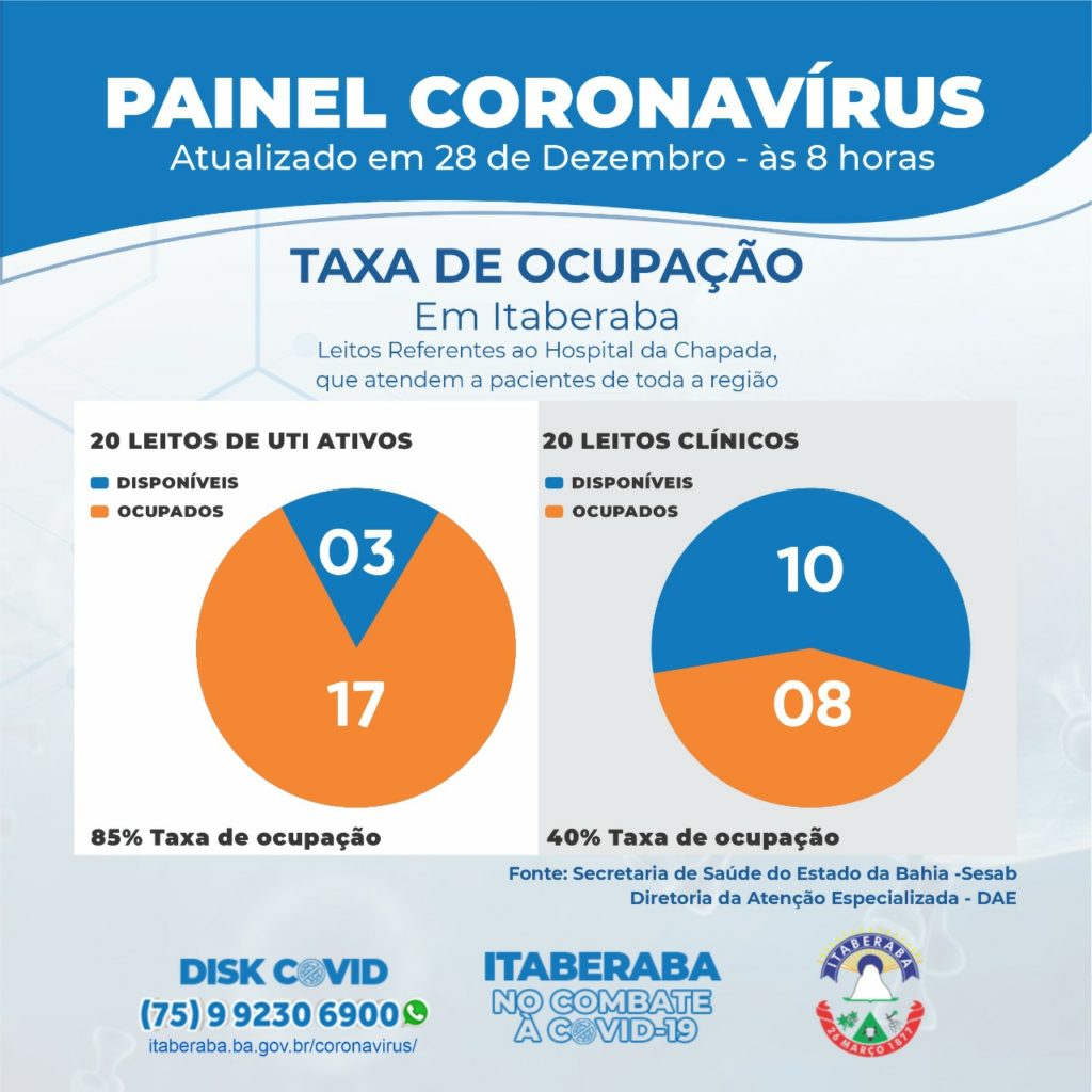 De acordo com o Boletim Oficial 28/12, até às 17h de domingo (27), os números da Taxa de Ocupação de Leitos Clínicos e de Unidades de Terapia Intensiva (UTIs) no município, com dados da Secretaria da Saúde do Estado da Bahia (Sesab), são os seguintes: dos 20 LEITOS DE UTI ATIVOS, 17 estão ocupados; ao passo que, dos 20 LEITOS CLÍNICOS, 8 estão ocupados atualmente.
