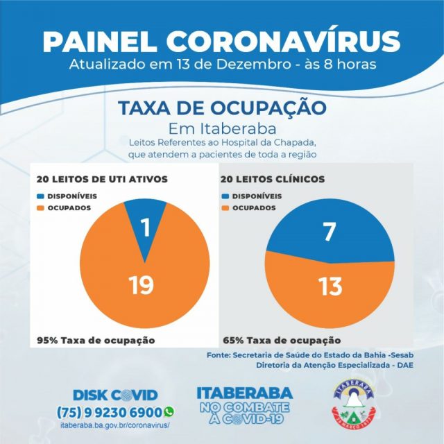 De acordo com o Boletim Oficial 13/12, até às 17h de sábado (12), os números da Taxa de Ocupação de Leitos Clínicos e de Unidades de Terapia Intensiva (UTIs) no município, com dados da Secretaria da Saúde do Estado da Bahia (Sesab), são os seguintes: dos 20 LEITOS DE UTI ATIVOS, 19 estão ocupados; ao passo que, dos 20 LEITOS CLÍNICOS, 13 estão ocupados atualmente.