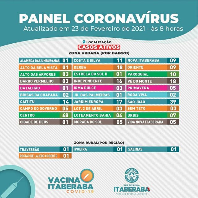 O município de Itaberaba já contabilizou 4.025 casos de covid-19 desde o início da pandemia. A informação foi divulgada pela Prefeitura, na manhã desta terça-feira (23) na atualização do Boletim Epidemiológico.