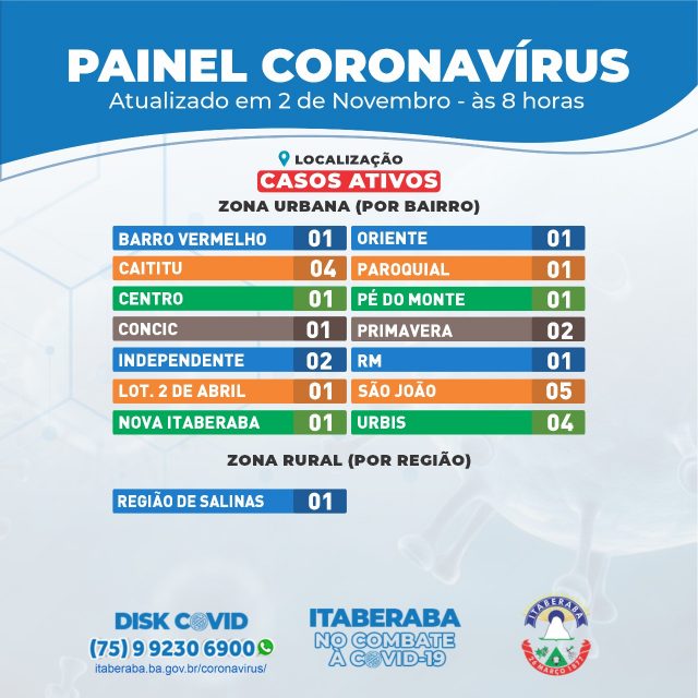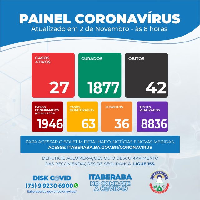 A Prefeitura de Itaberaba, por meio da Secretaria Municipal de Saúde (Sesau), assim como da Coordenação de Vigilância em Saúde e da Câmara Técnica (CT) de enfrentamento da pandemia do novo coronavírus, informa o Boletim Oficial 02/11 ㅡ com dados consolidados até às 17h de domingo (1º) ㅡ que, mais uma vez, NÃO registrou novos casos da COVID-19.