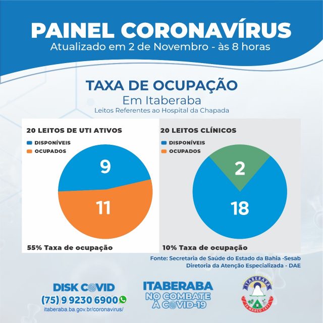 De acordo com o Boletim Oficial 02/11, até às 17h de domingo (1º), os números da Taxa de Ocupação de Leitos Clínicos e de Unidades de Terapia Intensiva (UTIs) no município, com dados da Secretaria da Saúde do Estado da Bahia (Sesab), são os seguintes: dos 20 LEITOS DE UTI ATIVOS, 11 estão ocupados; ao passo que, dos 20 LEITOS CLÍNICOS, 2 estão ocupados atualmente.