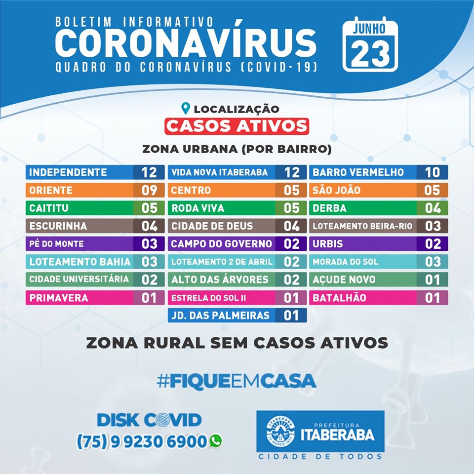 Nove pessoas ja perderam a vida por conta da Covid-19 em Itaberaba. A informação foi conformada pela prefeitura através do boletim epidemiológico divulgado na tarde desta terça-feira (23).