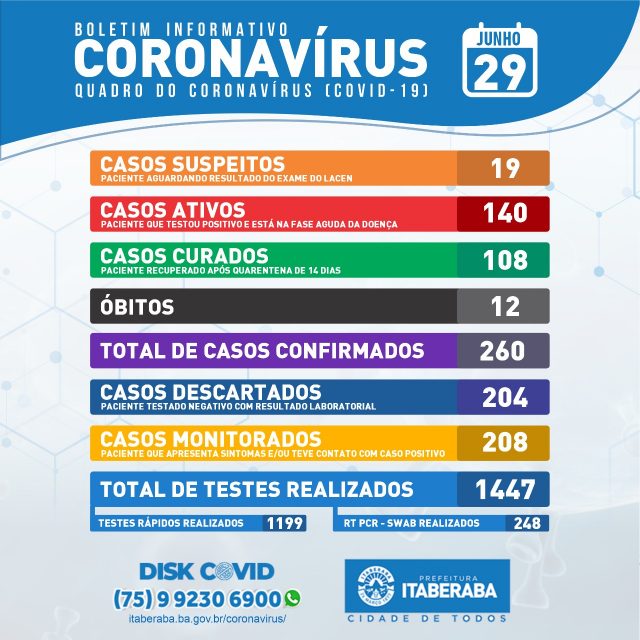 Desta forma, Itaberaba tem 19 casos suspeitos e, agora, conta com 260 casos confirmados de COVID-19, sendo 140 (53,85%) casos ativos; 108 (41,54%) casos curados; e 12 (4,62%) óbitos pela doença. Além disso, já foram realizados cerca de 1.447 testagens (dentre Testes Rápidos e RT-PCR-SWAB) e 208 pessoas seguem sendo Monitoradas. Outros 204 casos já foram descartados.