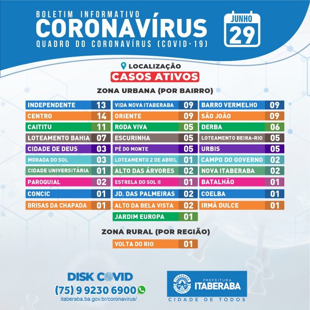 A Prefeitura de Itaberaba, através da Secretaria Municipal de Saúde (Sesau), por meio da Coordenação de Vigilância em Saúde e da Câmara Técnica, criada para o enfrentamento da pandemia do novo coronavírus, informa neste Boletim Oficial que, nesta segunda-feira (29), registrou 10 novos casos da COVID-19. Por outro lado, mais uma pessoa foi curada. Mais uma vez, não foram registrados óbitos.