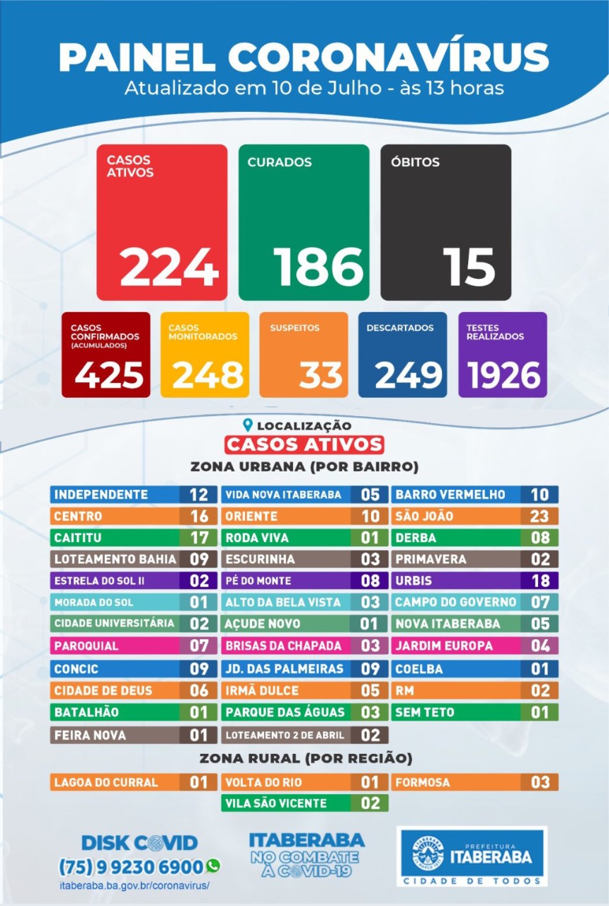 A Prefeitura de Itaberaba, através da Secretaria Municipal de Saúde (Sesau), assim como da Coordenação de Vigilância em Saúde e da Câmara Técnica (CT) de enfrentamento da pandemia do novo coronavírus, informa o Boletim Oficial 10/07 que, nesta sexta-feira (10), registrou 23 novos casos da COVID-19. Por outro lado, o número de pessoas curadas permaneceu estável em 186 casos. Também, não foram registrados novos óbitos pela doença.