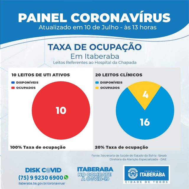 De acordo com o Boletim Oficial 10/07, até as 13h de hoje, os números da Taxa de Ocupação Leitos Clínicos e de Unidades de Terapia Intensiva (UTI) no município, com dados da Secretaria da Saúde do Estado da Bahia (Sesab), são os seguintes: dos 10 leitos de UTI ativos, 10 estão ocupados (100%); ao passo que, dos 20 leitos clínicos, 4 estão ocupados atualmente (20%).