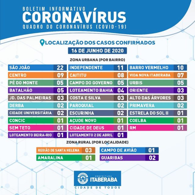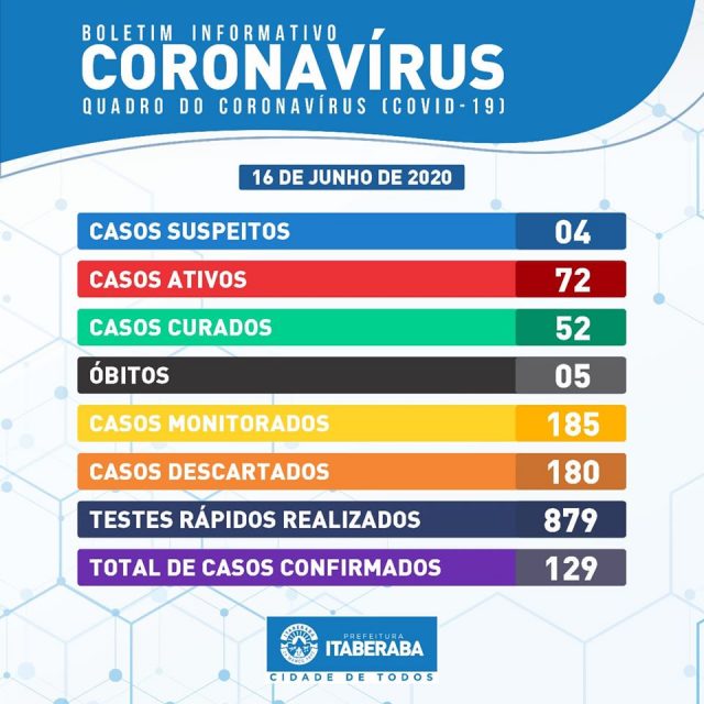 A cidade de Itaberaba já tem 05 óbitos e 129 casos confirmados de coronavírus. A informação foi publicada pela Prefeitura no inicio da tarde desta terça-feira (16) por meio do boletim epidemiológico diário.
