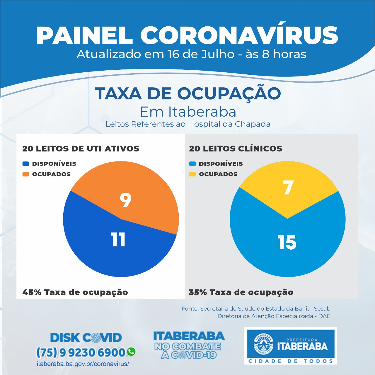 De acordo com o Boletim Oficial 16/07, até as 17h de quarta-feira (15), os números da Taxa de Ocupação Leitos Clínicos e de Unidades de Terapia Intensiva (UTI)* no município, com dados da Secretaria da Saúde do Estado da Bahia (Sesab), são os seguintes: dos 20 leitos de UTI ativos, 9 estão ocupados (45%); ao passo que, dos 20 leitos clínicos, 7 estão ocupados atualmente (35%).