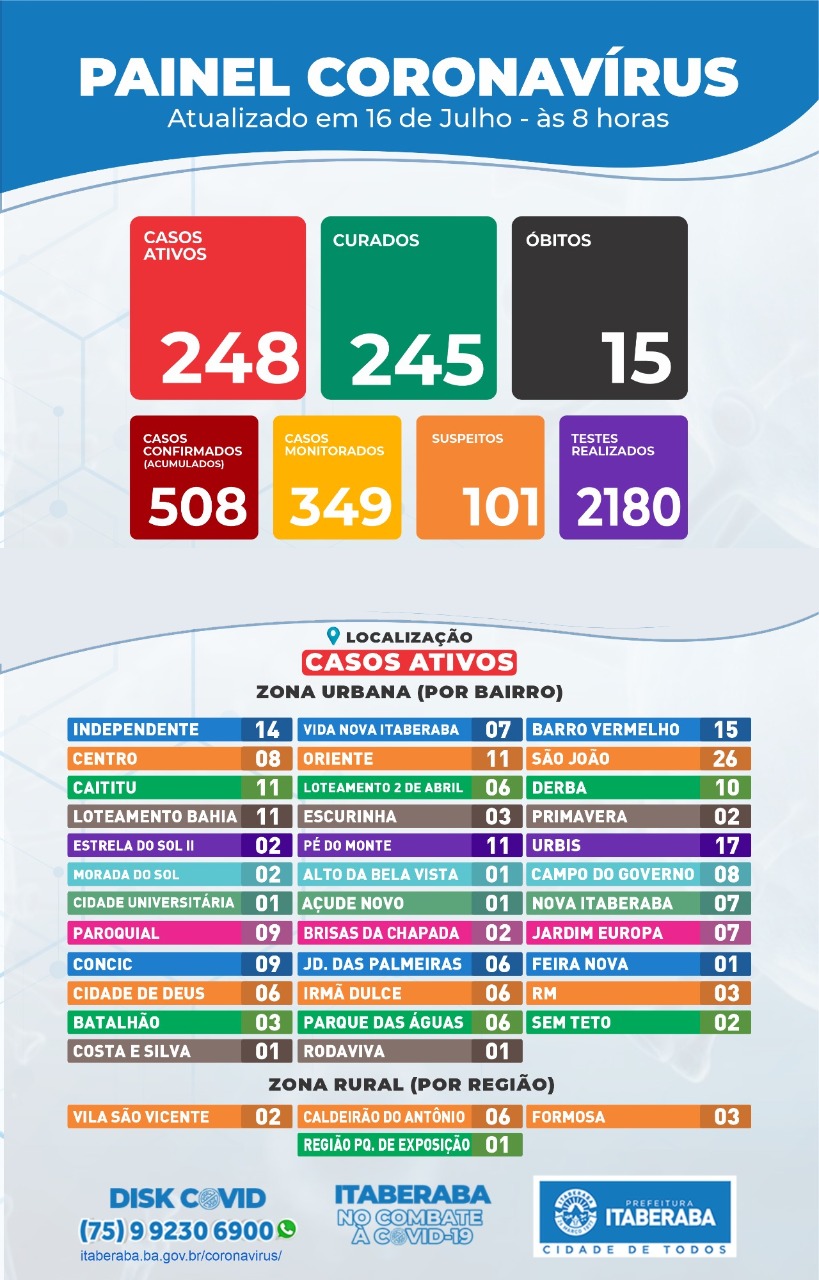 A Prefeitura de Itaberaba, através da Secretaria Municipal de Saúde (Sesau), assim como da Coordenação de Vigilância em Saúde e da Câmara Técnica (CT) de enfrentamento da pandemia do novo coronavírus, informa o Boletim Oficial 16/07 ㅡ com dados consolidados até as 17h de quarta-feira (15). O Boletim registrou 28 novos casos da COVID-19. Por outro lado, o número de pessoas curadas teve um aumento de 8,41%, passando de 226 a 245 casos (ou 19 curados). Não foram registrados novos óbitos pela doença.