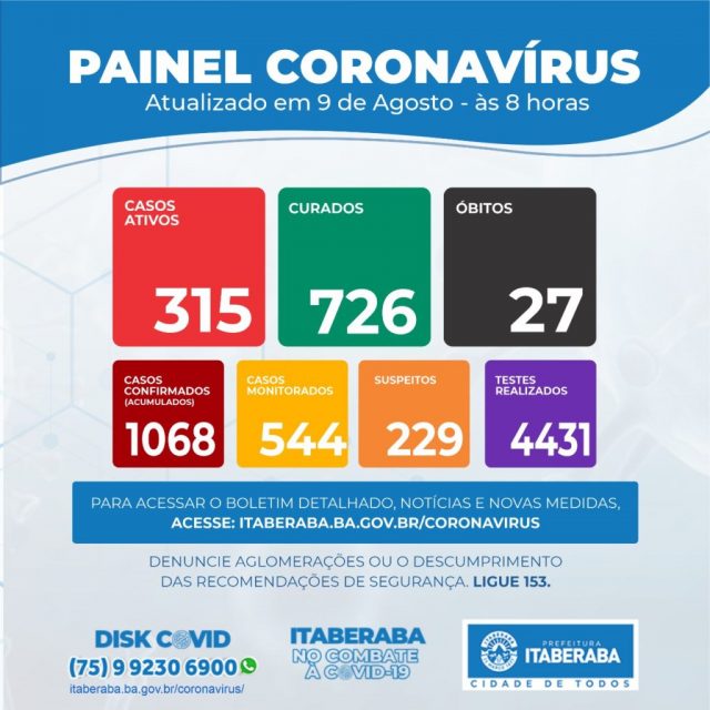 A Prefeitura de Itaberaba, por meio da Secretaria Municipal de Saúde (Sesau), assim como da Coordenação de Vigilância em Saúde e da Câmara Técnica (CT) de enfrentamento da pandemia do novo coronavírus, informa o Boletim Oficial 09/08 ㅡ com dados consolidados até as 17h de sábado (8) ㅡ que registrou 6 novos casos da COVID-19.