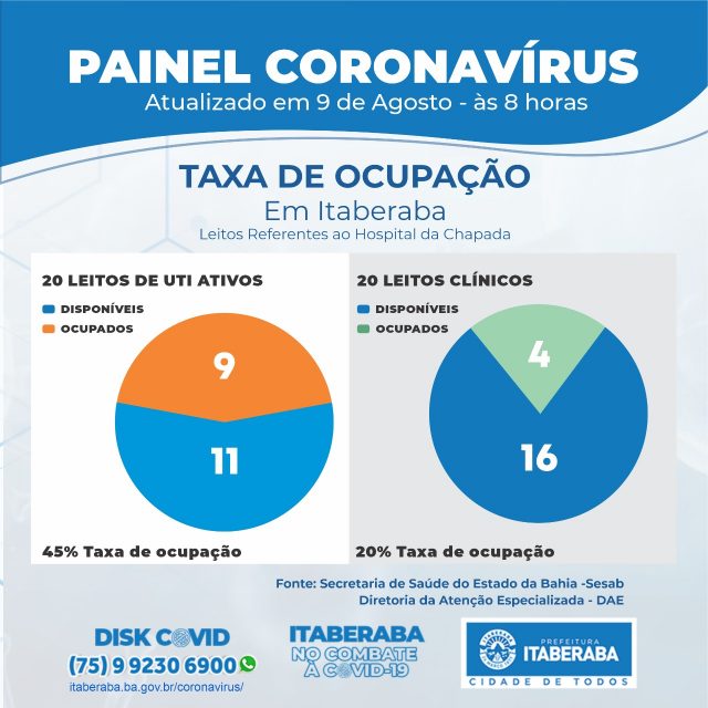 De acordo com o Boletim Oficial 09/08, até as 17h de sábado (8), os números da Taxa de Ocupação Leitos Clínicos e de Unidades de Terapia Intensiva (UTI) no município, com dados da Secretaria da Saúde do Estado da Bahia (Sesab), são os seguintes: dos 20 LEITOS DE UTI ATIVOS, 9 estão ocupados (45%); ao passo que, dos 20 LEITOS CLÍNICOS, 4 estão ocupados atualmente (20%). A taxa de ocupação geral é de 32,5%.
