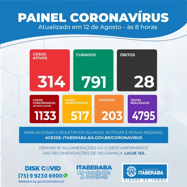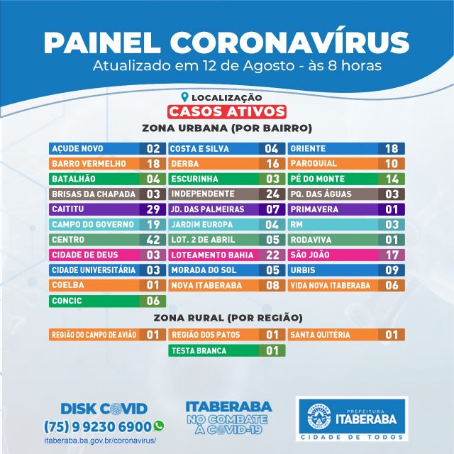 A Prefeitura de Itaberaba, por meio da Secretaria Municipal de Saúde (Sesau), assim como da Coordenação de Vigilância em Saúde e da Câmara Técnica (CT) de enfrentamento da pandemia do novo coronavírus, informa o Boletim Oficial 12/08 ㅡ com dados consolidados até as 17h de terça-feira (11) ㅡ que registrou 28 novos casos da COVID-19.