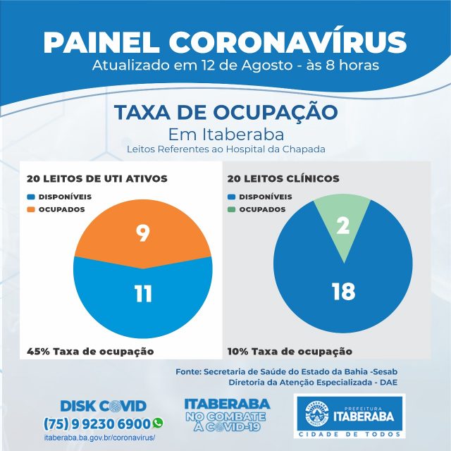 De acordo com o Boletim Oficial 12/08, até as 17h de terça-feira (11), os números da Taxa de Ocupação Leitos Clínicos e de Unidades de Terapia Intensiva (UTI) no município, com dados da Secretaria da Saúde do Estado da Bahia (Sesab), são os seguintes: dos 20 LEITOS DE UTI ATIVOS, 9 estão ocupados (45%); ao passo que, dos 20 LEITOS CLÍNICOS, 2 estão ocupados atualmente (10%). A taxa de ocupação geral é de 27,5%.