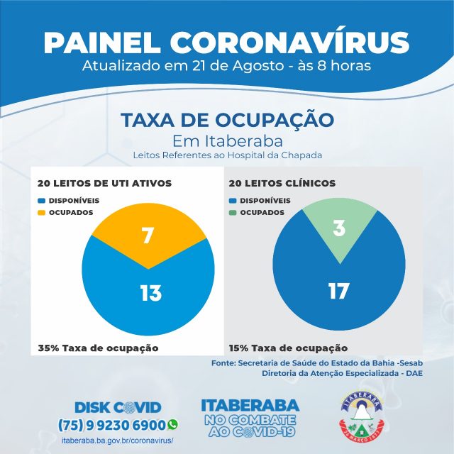 De acordo com o Boletim Oficial 21/08, até às 17h de quinta-feira (20), os números da Taxa de Ocupação Leitos Clínicos e de Unidades de Terapia Intensiva (UTI) no município, com dados da Secretaria da Saúde do Estado da Bahia (Sesab), são os seguintes: dos 20 LEITOS DE UTI ATIVOS, 7 estão ocupados (35%); ao passo que, dos 20 LEITOS CLÍNICOS, 3 estão ocupados atualmente (15%). A taxa de ocupação geral é de 25%.