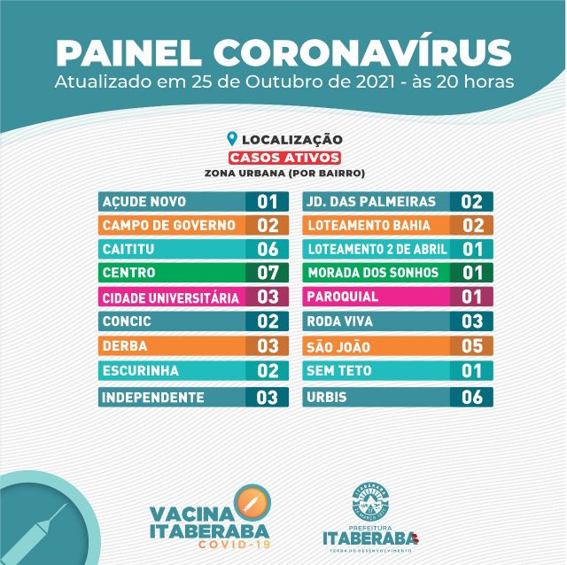 A Prefeitura de Itaberaba, por meio da Secretaria Municipal da Saúde, informa o boletim diário de segunda-feira (25) com dados consolidados até as 17h.