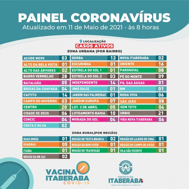 A Prefeitura de Itaberaba, por meio da Secretaria Municipal da Saúde, informa o boletim diário de terça-feira (11) com dados consolidados até as 17h de segunda-feira (10).