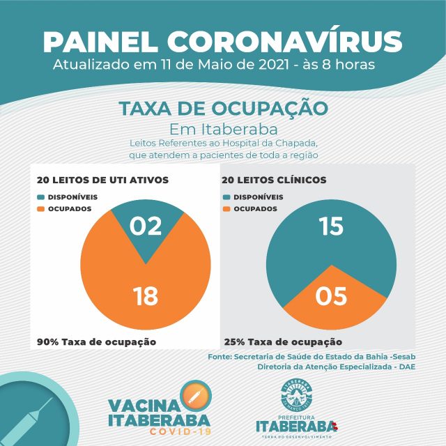 De acordo com o boletim diário de terça-feira (11), com dados consolidados até as 17h de segunda-feira (10), e de acordo com a as informações da Secretaria da Saúde do Estado da Bahia – SESAB, atualmente os números da taxa de ocupação de leitos no município são: 20 Leitos Clínicos, com 5 leitos ocupados, representando 25% de taxa de ocupação; 20 Leitos de Unidades de Terapia Intensiva – UTI, com 18 leitos ocupados, representando 90% de taxa de ocupação.