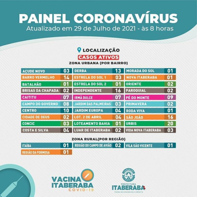 A Prefeitura de Itaberaba, por meio da Secretaria Municipal da Saúde, informa o boletim diário de quinta-feira (29) com dados consolidados até as 17h de quarta-feira (28).