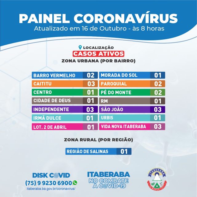 A Prefeitura de Itaberaba, por meio da Secretaria Municipal de Saúde (Sesau), assim como da Coordenação de Vigilância em Saúde e da Câmara Técnica (CT) de enfrentamento da pandemia do novo coronavírus, informa o Boletim Oficial 16/10 ㅡ com dados consolidados até às 17h de quinta-feira (15) ㅡ que registrou 11 novos casos da COVID-19.