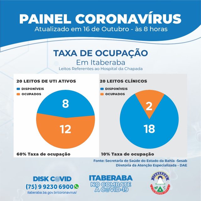 De acordo com o Boletim Oficial 16/10, até às 17h de quinta-feira (15), os números da Taxa de Ocupação de Leitos Clínicos e de Unidades de Terapia Intensiva (UTIs) no município, com dados da Secretaria da Saúde do Estado da Bahia (Sesab), são os seguintes: dos 20 LEITOS DE UTI ATIVOS, 12 estão ocupados; ao passo que, dos 20 LEITOS CLÍNICOS, 2 estão ocupados atualmente.