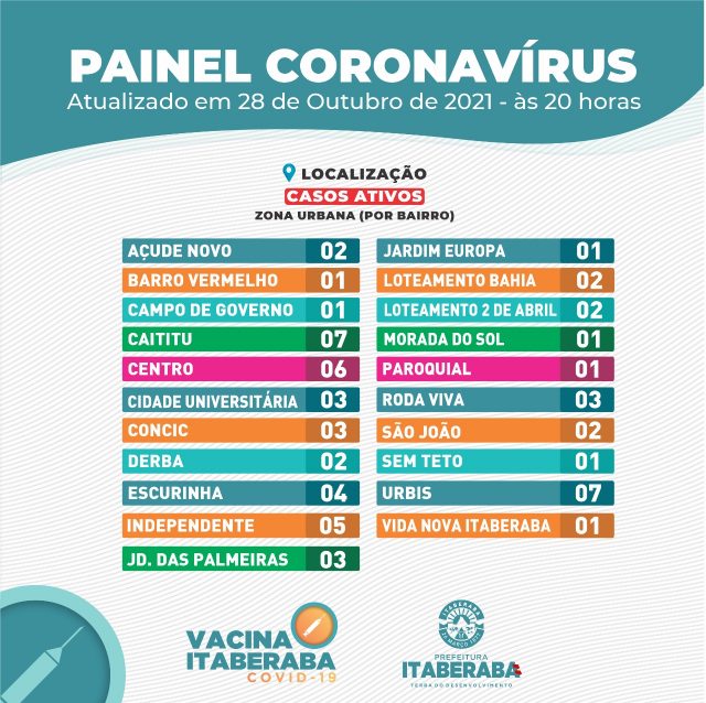A Prefeitura de Itaberaba, por meio da Secretaria Municipal da Saúde, informa o boletim diário de quinta-feira (28) com dados consolidados até as 17h.