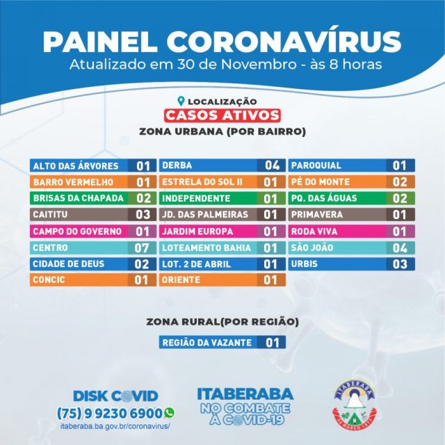 A Prefeitura de Itaberaba, por meio da Secretaria Municipal de Saúde (Sesau), assim como da Coordenação de Vigilância em Saúde e da Câmara Técnica (CT) de enfrentamento da pandemia do novo coronavírus, informa o Boletim Oficial 30/11 ㅡ com dados consolidados até às 17h de domingo (29) ㅡ que registrou 15 novos casos da COVID-19.