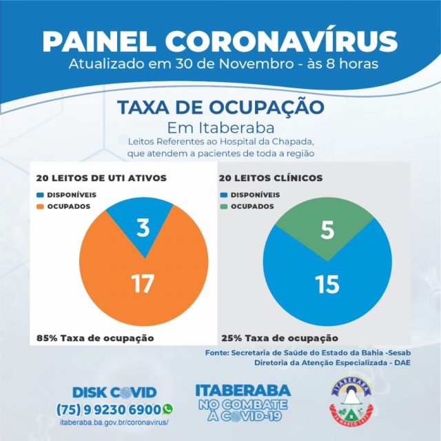 De acordo com o Boletim Oficial 30/11, até às 17h de domigo (29), os números da Taxa de Ocupação de Leitos Clínicos e de Unidades de Terapia Intensiva (UTIs) no município, com dados da Secretaria da Saúde do Estado da Bahia (Sesab), são os seguintes: dos 20 LEITOS DE UTI ATIVOS, 17 estão ocupados; ao passo que, dos 20 LEITOS CLÍNICOS, 5 estão ocupados atualmente.
