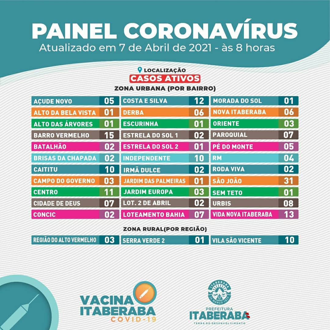 A cidade de Itaberaba registrou, nas ultimas 24 horas, duas mortes e 35 novos casos da COVID-19. As informações foram divulgadas pela Prefeitura, na manhã desta quarta-feira (07) no Painel Coronavírus.