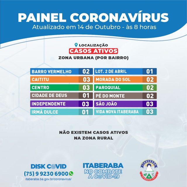 A Prefeitura de Itaberaba, por meio da Secretaria Municipal de Saúde (Sesau), assim como da Coordenação de Vigilância em Saúde e da Câmara Técnica (CT) de enfrentamento da pandemia do novo coronavírus, informa o Boletim Oficial 14/10 ㅡ com dados consolidados até às 17h de terça-feira (13) ㅡ que registrou 2 novos casos da COVID-19.