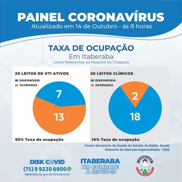 De acordo com o Boletim Oficial 14/10, até às 17h de terça-feira (13), os números da Taxa de Ocupação de Leitos Clínicos e de Unidades de Terapia Intensiva (UTIs) no município, com dados da Secretaria da Saúde do Estado da Bahia (Sesab), são os seguintes: dos 20 LEITOS DE UTI ATIVOS, 13 estão ocupados; ao passo que, dos 20 LEITOS CLÍNICOS, 2 estão ocupados atualmente.