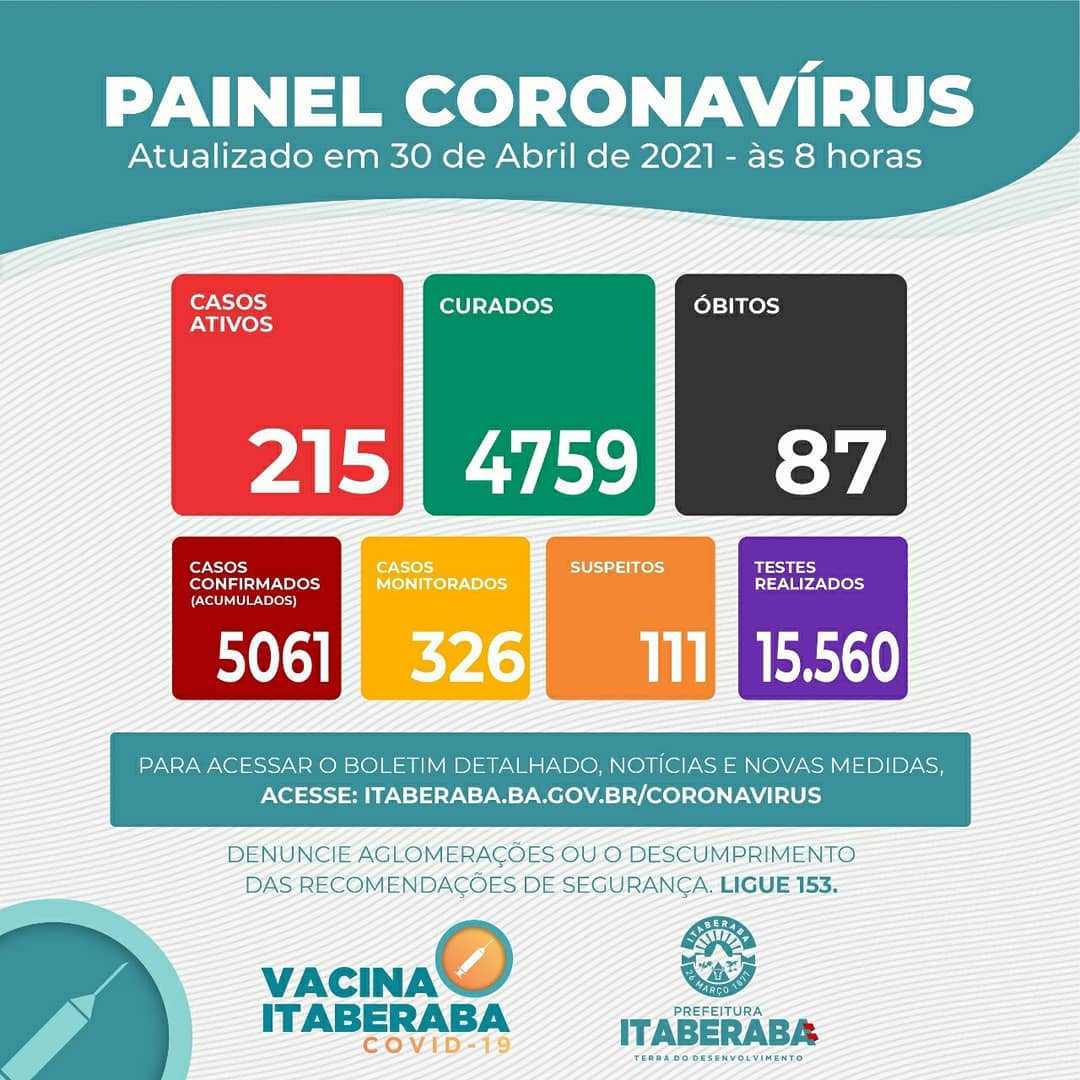 Atualmente Itaberaba tem 215 casos ativos, 111 casos suspeitos, 326 casos monitorados e 87 óbitos registrados pela doença. O número de casos curados é de 4.759 e, ao todo, já foram confirmados 5.061 casos da COVID-19 no município. Além disso, já foram realizados o total de 15.560 exames, dentre Testes Rápidos e RT-PCR/SWAB.