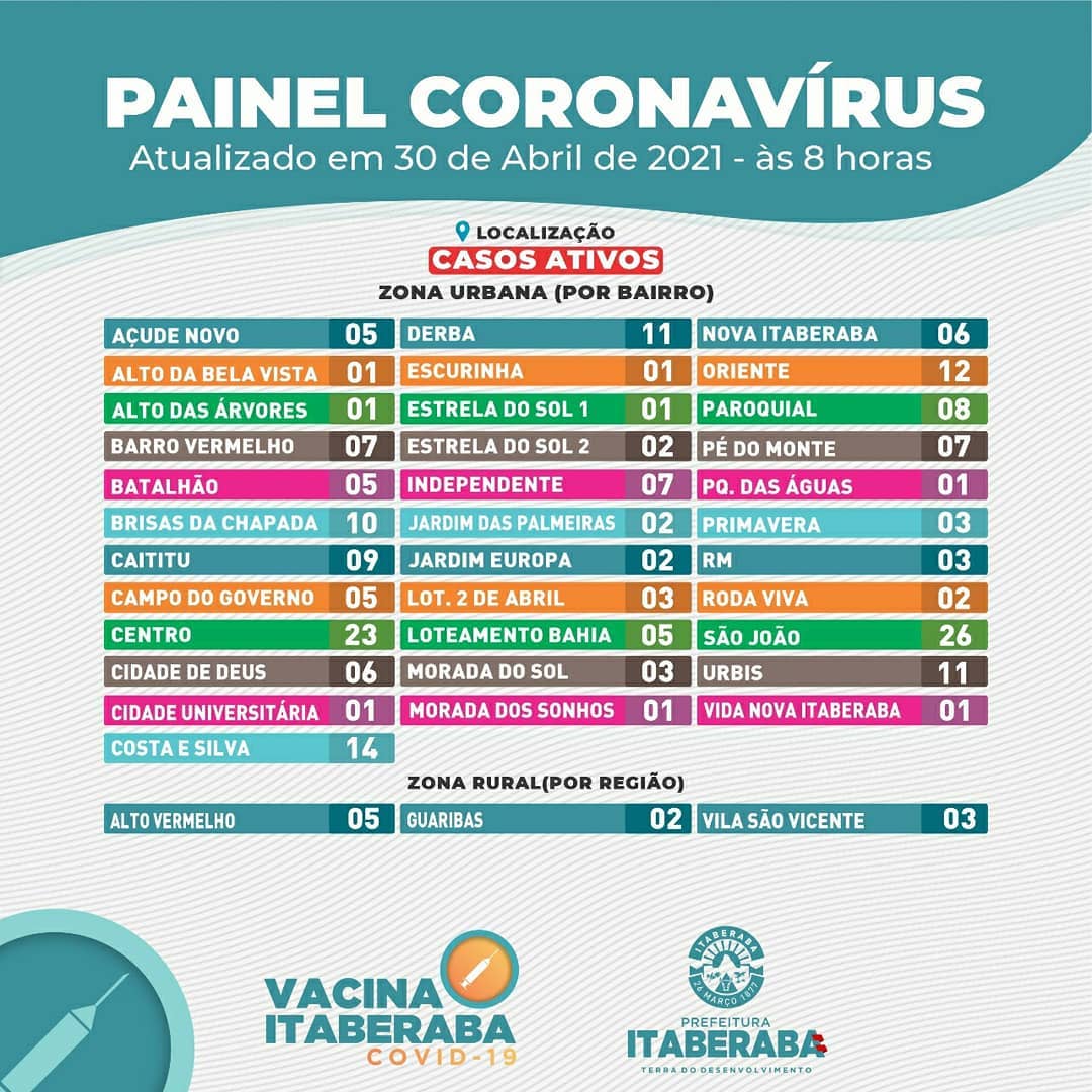 A Prefeitura de Itaberaba, por meio da Secretaria Municipal da Saúde, informa o boletim diário de sexta-feira (30) com dados consolidados até as 17h de quinta-feira (29).