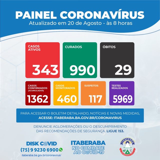 A Prefeitura de Itaberaba, por meio da Secretaria Municipal de Saúde (Sesau), assim como da Coordenação de Vigilância em Saúde e da Câmara Técnica (CT) de enfrentamento da pandemia do novo coronavírus, informa o Boletim Oficial 20/08 ㅡ com dados consolidados até às 17h de quarta-feira (19) ㅡ que registrou 23 novos casos da COVID-19.