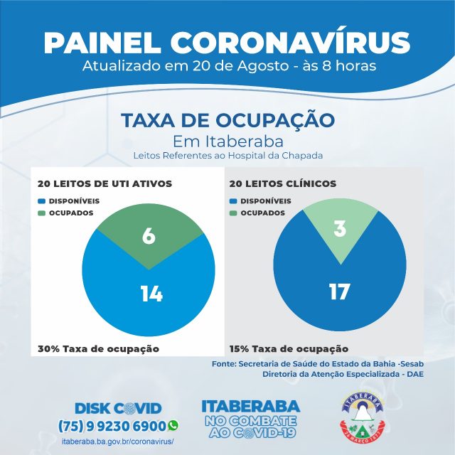 De acordo com o Boletim Oficial 20/08, até às 17h de quarta-feira (19), os números da Taxa de Ocupação Leitos Clínicos e de Unidades de Terapia Intensiva (UTI) no município, com dados da Secretaria da Saúde do Estado da Bahia (Sesab), são os seguintes: dos 20 LEITOS DE UTI ATIVOS, 6 estão ocupados (30%); ao passo que, dos 20 LEITOS CLÍNICOS, 3 estão ocupados atualmente (15%). A taxa de ocupação geral é de 22,5%.