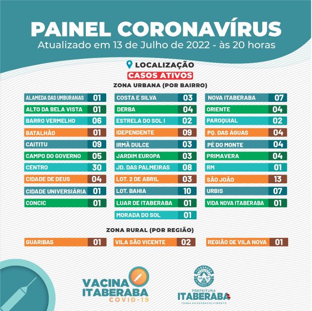 A Prefeitura de Itaberaba, por meio da Secretaria Municipal da Saúde, informa o boletim diário de quarta-feira (13) com dados consolidados até as 17h de terça-feira (12).