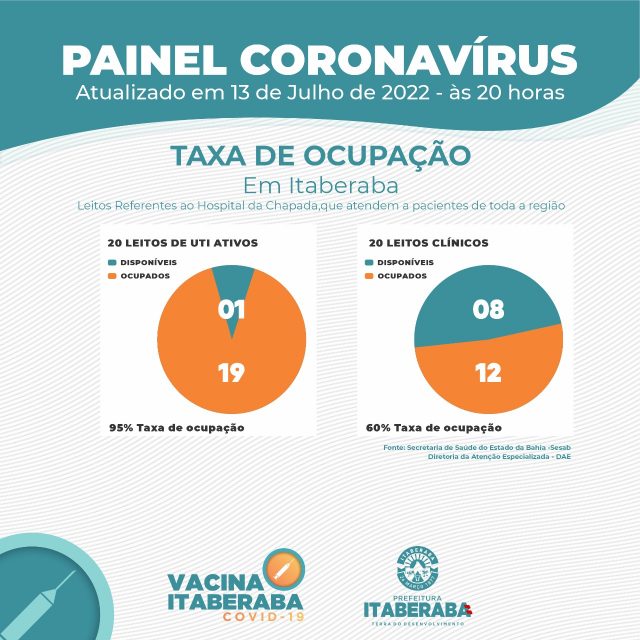 De acordo com o boletim diário de quarta-feira (13) e do Estado da Bahia – SESAB, atualmente os números da taxa de ocupação de leitos no município são: 20 Leitos Clínicos, 12 leitos ocupados, representando 60% de taxa de ocupação; 20 Leitos de Unidades de Terapia Intensiva – UTI, 19 leitos ocupados, representando 95% de taxa de ocupação.