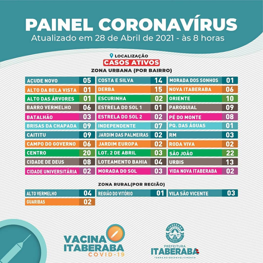A Prefeitura de Itaberaba, por meio da Secretaria Municipal da Saúde, informa o boletim diário de quarta-feira (28) com dados consolidados até as 17h de terça-feira (27).