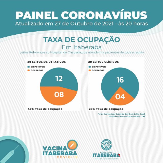 De acordo com o boletim diário de quarta-feira (27) e do Estado da Bahia – SESAB, atualmente os números da taxa de ocupação de leitos no município são: 20 Leitos Clínicos, 4 leitos ocupados, representando 20% de taxa de ocupação; 20 Leitos de Unidades de Terapia Intensiva – UTI, com 8 leitos ocupados, representando 40% de taxa de ocupação.
