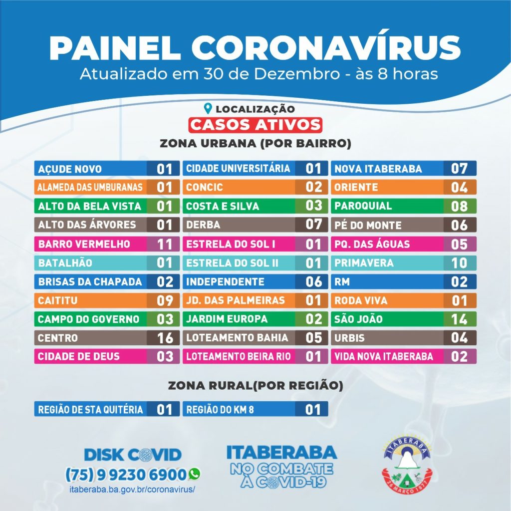 A Prefeitura de Itaberaba, por meio da Secretaria Municipal de Saúde (Sesau), assim como da Coordenação de Vigilância em Saúde e da Câmara Técnica (CT) de enfrentamento da pandemia do novo coronavírus, informa o Boletim Oficial 30/12 ㅡ com dados consolidados até às 17h de terça-feira (29) ㅡ que registrou 31 novos casos da COVID-19.