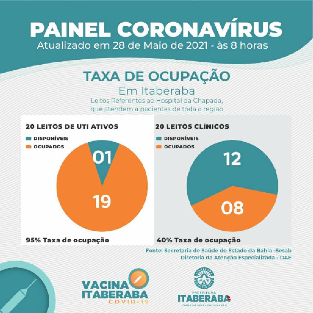 De acordo com o boletim diário de sexta-feira (28), com dados consolidados até as 17h de quinta-feira (27), e de acordo com a as informações da Secretaria da Saúde do Estado da Bahia – SESAB, atualmente os números da taxa de ocupação de leitos no município são: 20 Leitos Clínicos, com 8 leitos ocupados, representando 40% de taxa de ocupação; 20 Leitos de Unidades de Terapia Intensiva – UTI, com 19 leitos ocupados, representando 95% de taxa de ocupação.