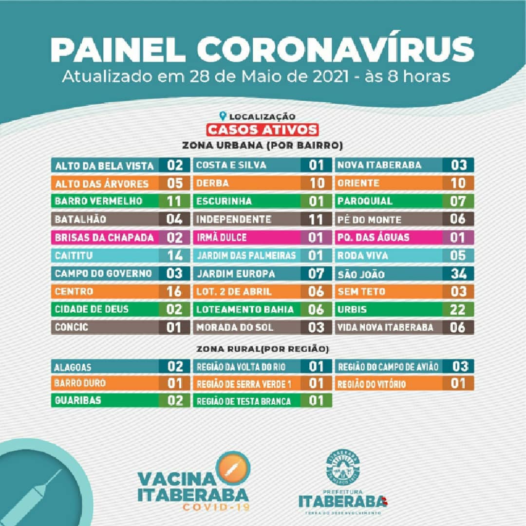 A Prefeitura de Itaberaba, por meio da Secretaria Municipal da Saúde, informa o boletim diário de sexta-feira (28) com dados consolidados até as 17h de quinta-feira (27)