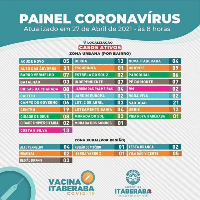 A Prefeitura de Itaberaba, por meio da Secretaria Municipal da Saúde, informa o boletim diário de terça-feira (27) com dados consolidados até as 17h de segunda-feira (26).