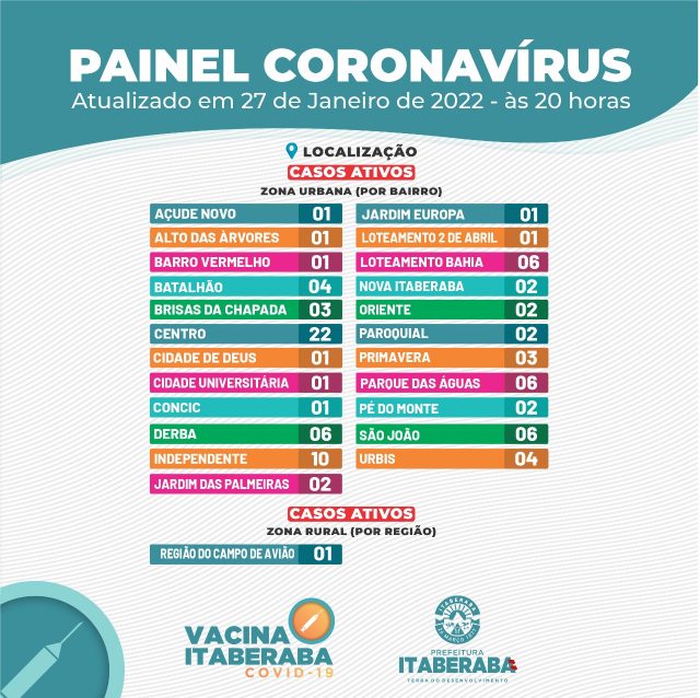 A Prefeitura de Itaberaba, por meio da Secretaria Municipal da Saúde, informa o boletim diário de quinta-feira (27) com dados consolidados até as 17h.