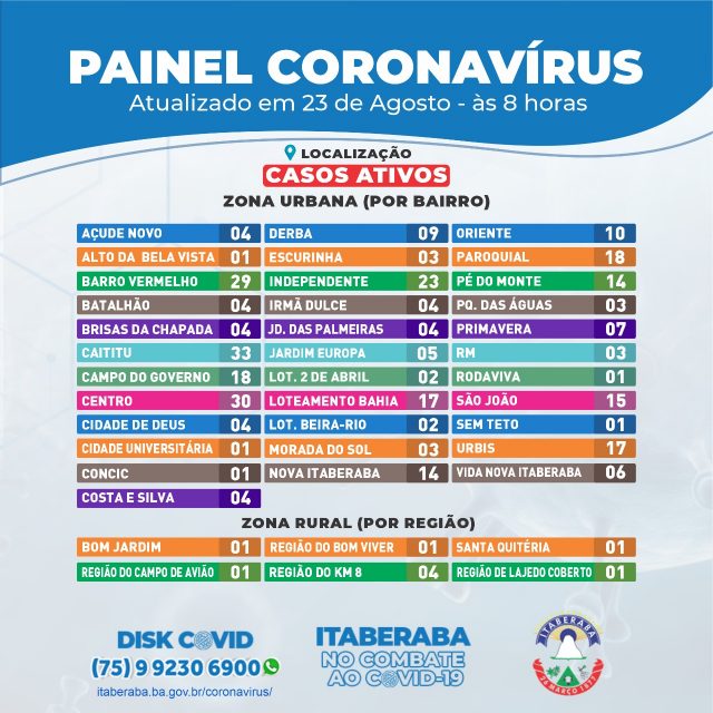 A Prefeitura de Itaberaba, por meio da Secretaria Municipal de Saúde (Sesau), assim como da Coordenação de Vigilância em Saúde e da Câmara Técnica (CT) de enfrentamento da pandemia do novo coronavírus, informa o Boletim Oficial 23/08 ㅡ com dados consolidados até às 17h de sábado (22) ㅡ que registrou 5 novos casos da COVID-19.