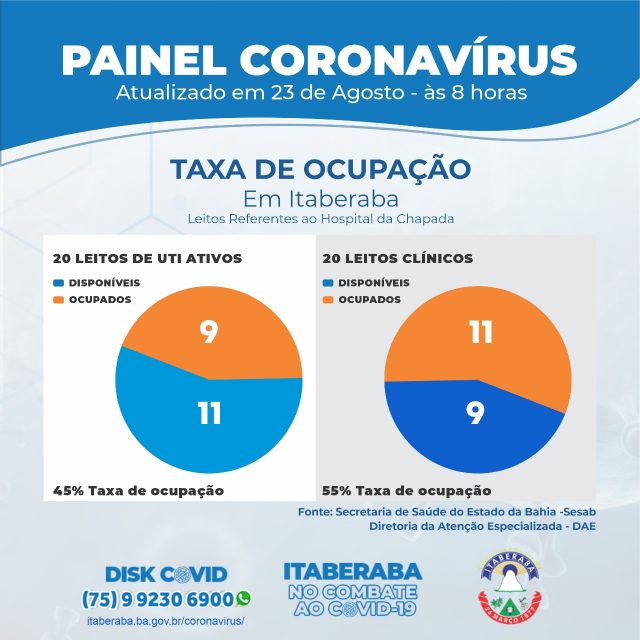 De acordo com o Boletim Oficial 23/08, até às 17h de sábado (22), os números da Taxa de Ocupação Leitos Clínicos e de Unidades de Terapia Intensiva (UTI) no município, com dados da Secretaria da Saúde do Estado da Bahia (Sesab), são os seguintes: dos 20 LEITOS DE UTI ATIVOS, 9 estão ocupados (45%); ao passo que, dos 20 LEITOS CLÍNICOS, 11 estão ocupados atualmente (55%). A taxa de ocupação geral é de 50%.