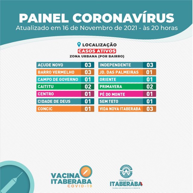 A Prefeitura de Itaberaba, por meio da Secretaria Municipal da Saúde, informa o boletim diário de terça-feira (16) com dados consolidados até as 17h.