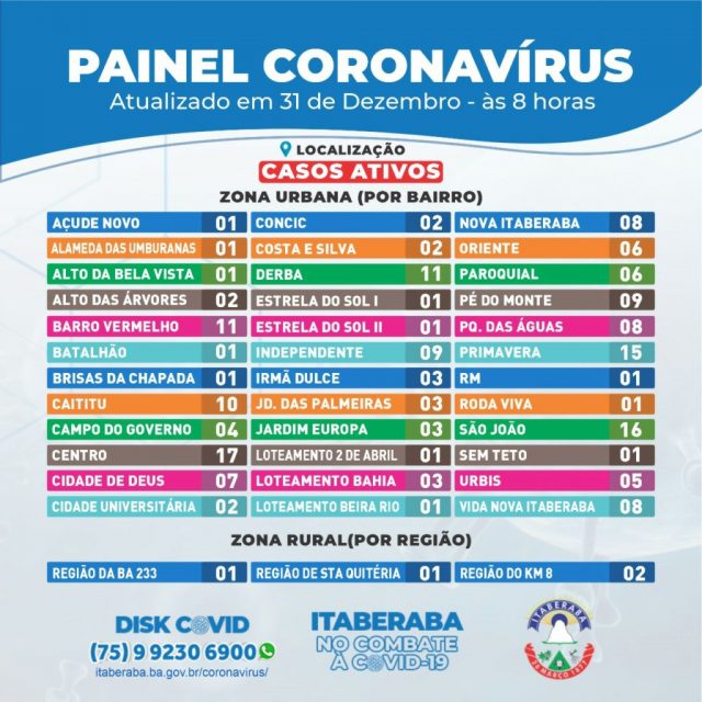 A Prefeitura de Itaberaba, por meio da Secretaria Municipal de Saúde (Sesau), assim como da Coordenação de Vigilância em Saúde e da Câmara Técnica (CT) de enfrentamento da pandemia do novo coronavírus, informa o Boletim Oficial 31/12 ㅡ com dados consolidados até às 17h de quarta-feira (30) ㅡ que registrou 73 novos casos da COVID-19.