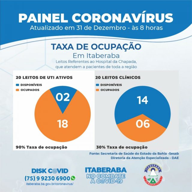 De acordo com o Boletim Oficial 31/12, até às 17h de quarta-feira (30), os números da Taxa de Ocupação de Leitos Clínicos e de Unidades de Terapia Intensiva (UTIs) no município, com dados da Secretaria da Saúde do Estado da Bahia (Sesab), são os seguintes: dos 20 LEITOS DE UTI ATIVOS, 18 estão ocupados; ao passo que, dos 20 LEITOS CLÍNICOS, 6 estão ocupados atualmente.