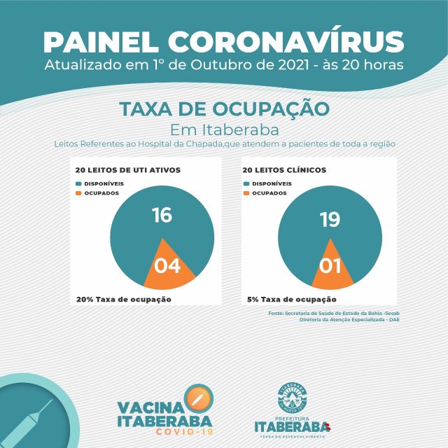 De acordo com o boletim diário de segunda-feira (04) e do Estado da Bahia – SESAB, atualmente os números da taxa de ocupação de leitos no município são: 20 Leitos Clínicos, 1 leito ocupad, representando 5% de taxa de ocupação; 20 Leitos de Unidades de Terapia Intensiva – UTI, com 4 leitos